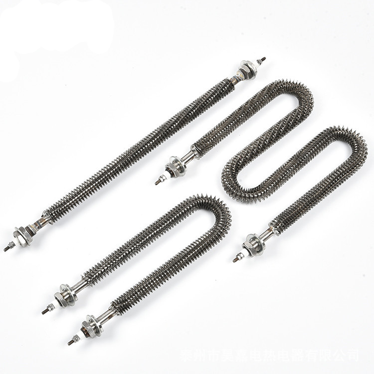 翅片式電加熱管,是在普通元件表面纏繞金屬散熱片,與普通元件相比散熱面積擴大了2~3倍,即翅片元件所允許的表面功率負荷是普通元件的3~4倍。由于元件的長度縮短,使得本身的熱損失減小,在相同的功率條件下具有升溫快、發熱均勻、散熱性能好、熱效率高、使用壽命長、加熱裝置體積小,成本低等優點。根據用戶要求進行了合理的設計,便于安裝。